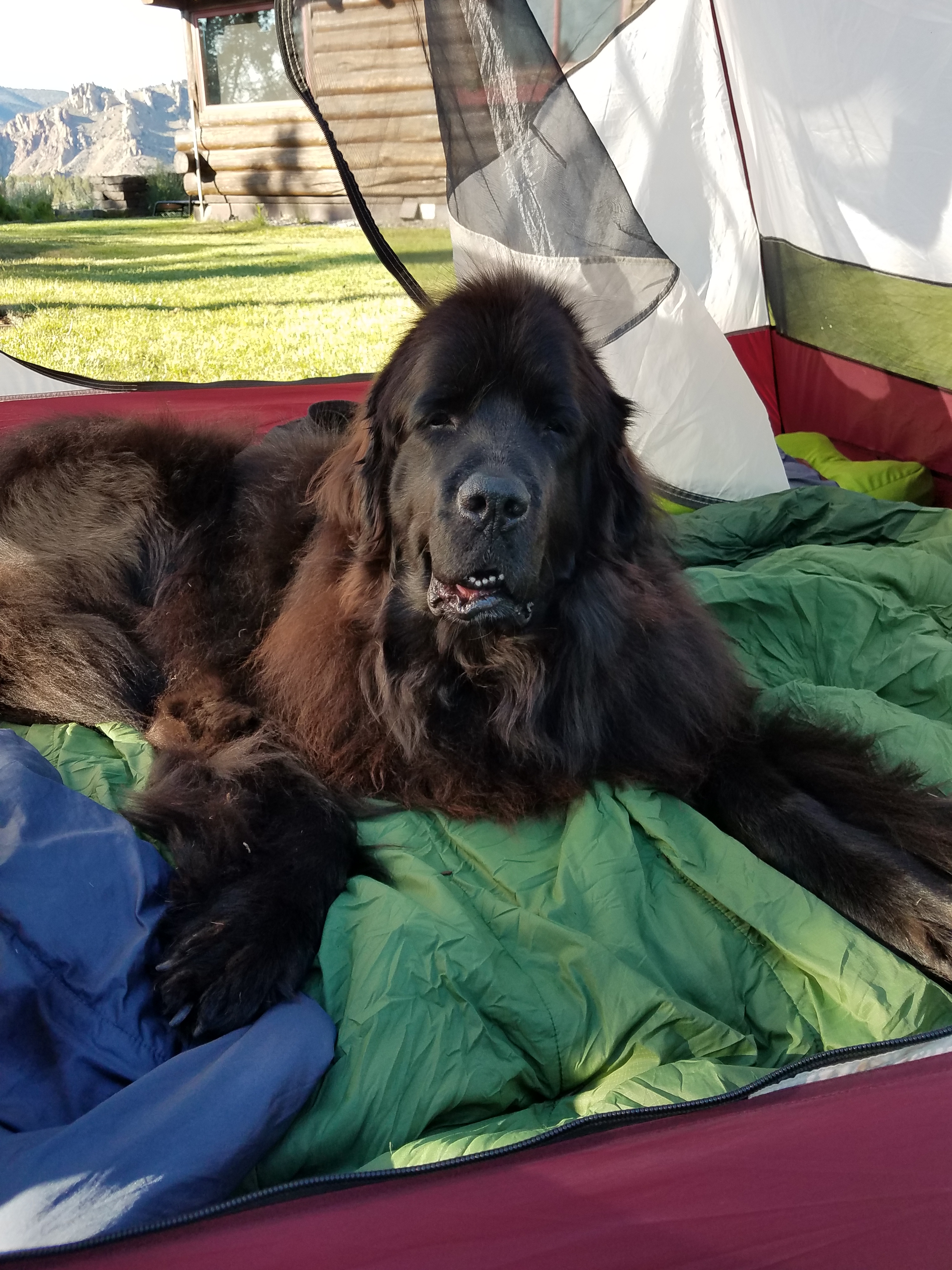 He’s got a Newfoundland dog. Next thing you know he invites us over to his house. We pitch our tent in his yard which just happens to be on a cliff overlooking Smith Rock Park.