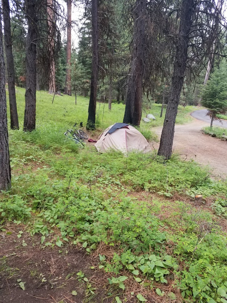 Our usual way is Mike rides about a 1/4 mike ahead of me and every few miles he waits while i catch up. My muscles just shake sometimes. At least the sun wasn’t beating down so hard. It was an overcast 80 degree morning but by noon we started to hear rumbles of thunder. We tried to outrun the storm but by about 2pm we were running for cover. It’s hard to know where to hide when you are alone in the forest surrounded by trees. We finally surrendered and pitched our tent in the state park at the top of the pass.